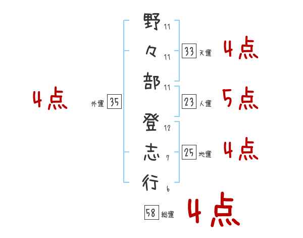外運![]() | 野々部登志行さんの外運は35画の4つ星!温厚な性格で感受性が高い。穏和な性格で人望が厚い。 生活面を象徴する運勢です。外部から受ける影響力を表し、結婚運、家庭運や職場、環境への順応性を表します。 |