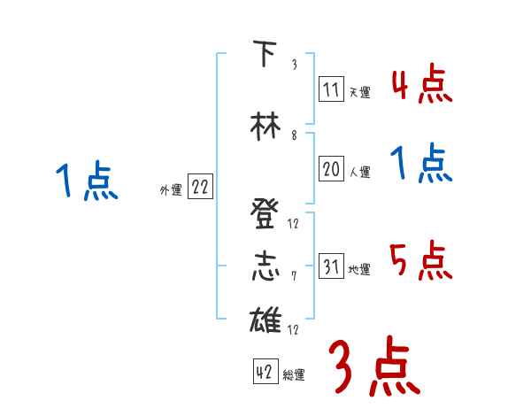 天運![]() | 下林登志雄さんの天運は11画の4つ星!着実に富や地位を得る幸運な人生。 家系が持つ宿命的な運勢を表します。祖先から受け継いだ苗字ですので自分の力が及びません。家柄を象徴します。 |