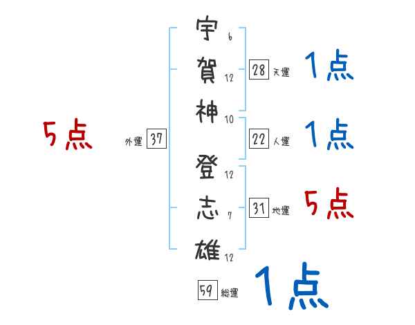 人運![]() | 宇賀神登志雄さんの人運は22画の1つ星!努力することが苦手ないっぽう手先が器用。芸術性にも優れる。 性格や才能などを表す2番目に重要な運勢です。人間関係や協調性、社会的な成功に影響します。主に20歳から50歳ぐらいまでの中年期の運勢を表します。 |