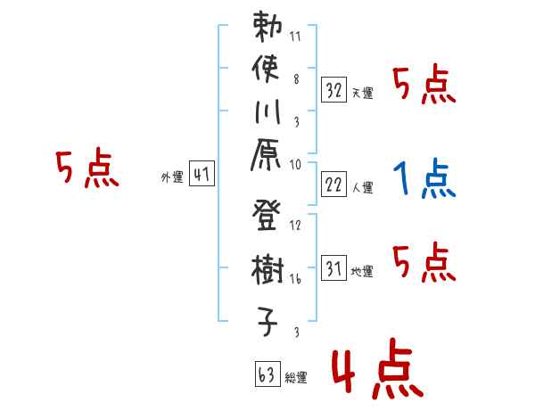 天運![]() | 勅使川原登樹子さんの天運は32画の5つ星!柔軟性があり成功する。チャンスが多く金運が良い。 家系が持つ宿命的な運勢を表します。祖先から受け継いだ苗字ですので自分の力が及びません。家柄を象徴します。 |