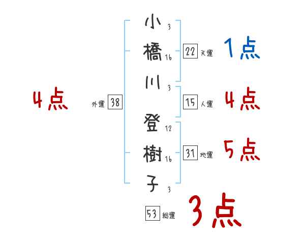 総運![]() | 小橋川登樹子さんの総運は53画の3つ星!やや見栄っ張りで虚栄心がある。散財に注意。 あなたの人生を表す1番重要な運勢です。生涯を通じて影響する総合運となり、主に50歳以降の晩年期に影響を及ぼします。 |