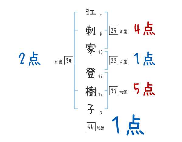 天運![]() | 江刺家登樹子さんの天運は25画の4つ星!個性があり才能があふれる。強運の持ち主で発展する。 家系が持つ宿命的な運勢を表します。祖先から受け継いだ苗字ですので自分の力が及びません。家柄を象徴します。 |