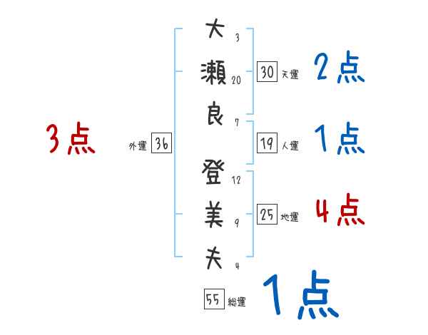 外運![]() | 大瀬良登美夫さんの外運は36画の3つ星!先見性が豊かです。多少神経質で苦労することも。 生活面を象徴する運勢です。外部から受ける影響力を表し、結婚運、家庭運や職場、環境への順応性を表します。 |