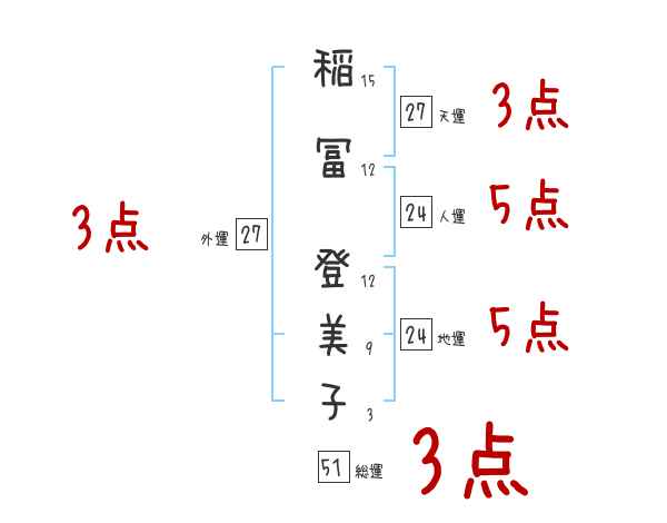 総運![]() | 稲冨登美子さんの総運は51画の3つ星!変化が激しく、危険に注意。堅実な性格。 あなたの人生を表す1番重要な運勢です。生涯を通じて影響する総合運となり、主に50歳以降の晩年期に影響を及ぼします。 |