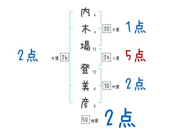 総運![]() | 内木場登美彦さんの総運は50画の2つ星!浮き沈みが激しく不安定。しりすぼみに衰退しやすいので注意しましょう。 あなたの人生を表す1番重要な運勢です。生涯を通じて影響する総合運となり、主に50歳以降の晩年期に影響を及ぼします。 |