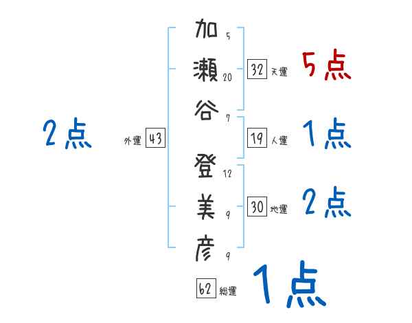 天運![]() | 加瀬谷登美彦さんの天運は32画の5つ星!柔軟性があり成功する。チャンスが多く金運が良い。 家系が持つ宿命的な運勢を表します。祖先から受け継いだ苗字ですので自分の力が及びません。家柄を象徴します。 |