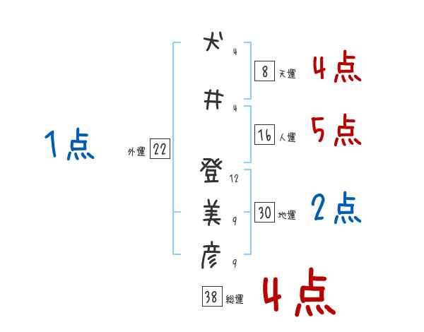 外運![]() | 犬井登美彦さんの外運は22画の1つ星!努力することが苦手ないっぽう手先が器用。芸術性にも優れる。 生活面を象徴する運勢です。外部から受ける影響力を表し、結婚運、家庭運や職場、環境への順応性を表します。 |
