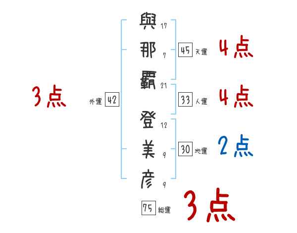天運![]() | 與那覇登美彦さんの天運は45画の4つ星!もくもくと物事を進め達成する。地味な努力家。 家系が持つ宿命的な運勢を表します。祖先から受け継いだ苗字ですので自分の力が及びません。家柄を象徴します。 |