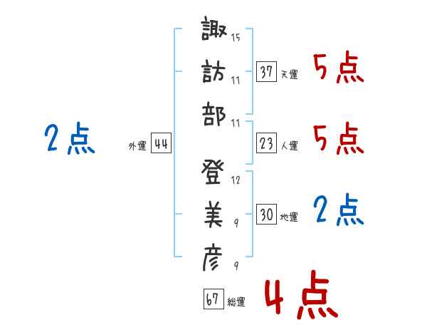 外運![]() | 諏訪部登美彦さんの外運は44画の2つ星!誠実で慎重な性格。物事を考えすぎないように注意しましょう。 生活面を象徴する運勢です。外部から受ける影響力を表し、結婚運、家庭運や職場、環境への順応性を表します。 |
