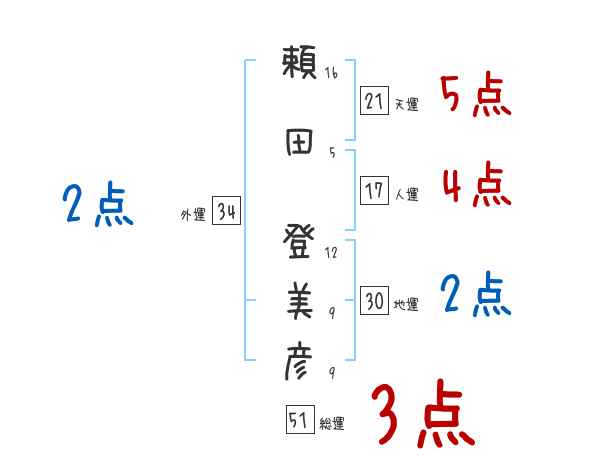 天運![]() | 頼田登美彦さんの天運は21画の5つ星!統率力がある。独立し成功する。名誉を手に入れる。 家系が持つ宿命的な運勢を表します。祖先から受け継いだ苗字ですので自分の力が及びません。家柄を象徴します。 |