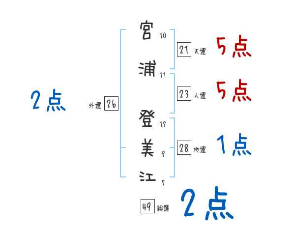 外運![]() | 宮浦登美江さんの外運は26画の2つ星!波瀾万丈かも。信頼できる人を大事にしましょう。 生活面を象徴する運勢です。外部から受ける影響力を表し、結婚運、家庭運や職場、環境への順応性を表します。 |