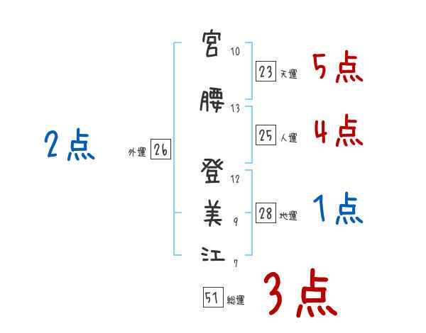 天運![]() | 宮腰登美江さんの天運は23画の5つ星!想像力に優れ活力がある。一代で成功し名誉を手に入れる。 家系が持つ宿命的な運勢を表します。祖先から受け継いだ苗字ですので自分の力が及びません。家柄を象徴します。 |