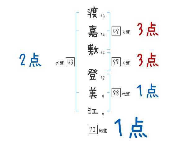 天運![]() | 渡嘉敷登美江さんの天運は42画の3つ星!病気に注意。多芸であるが消極的でおとなしい。 家系が持つ宿命的な運勢を表します。祖先から受け継いだ苗字ですので自分の力が及びません。家柄を象徴します。 |