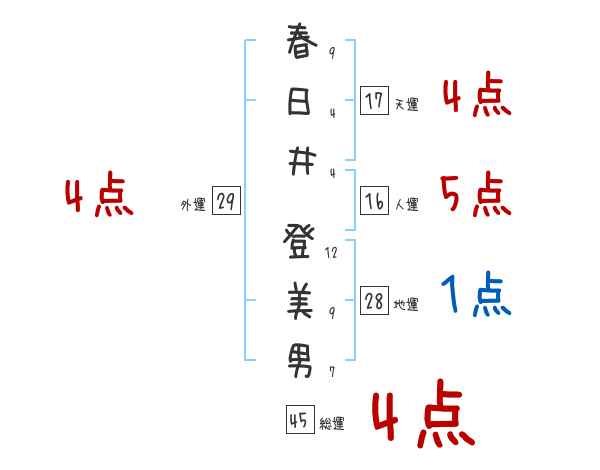 外運![]() | 春日井登美男さんの外運は29画の4つ星!完全主義で才能がある。厳格な心の持ち主。 生活面を象徴する運勢です。外部から受ける影響力を表し、結婚運、家庭運や職場、環境への順応性を表します。 |