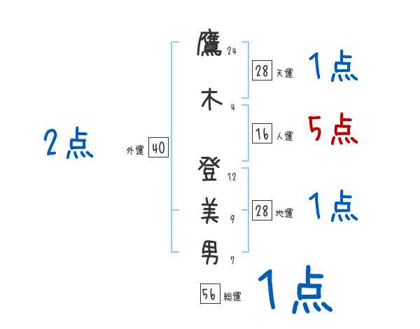 天運![]() | 鷹木登美男さんの天運は28画の1つ星!家庭環境に注意。スポーツで活躍できる能力があるかも。 家系が持つ宿命的な運勢を表します。祖先から受け継いだ苗字ですので自分の力が及びません。家柄を象徴します。 |