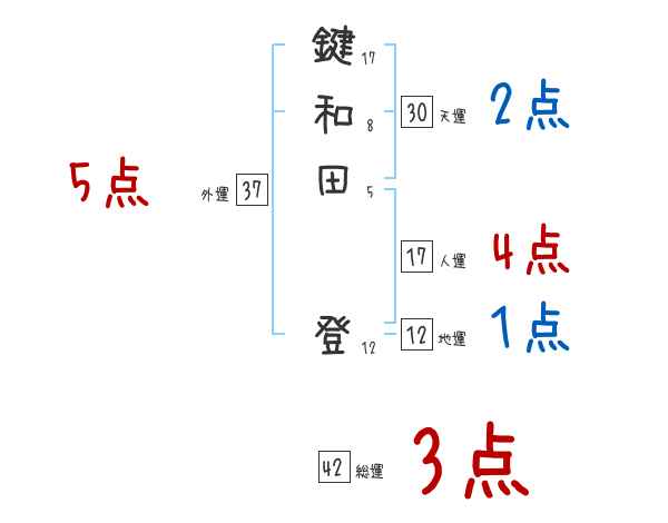 天運![]() | 鍵和田登さんの天運は30画の2つ星!浮き沈みの激しさに注意しましょう。 家系が持つ宿命的な運勢を表します。祖先から受け継いだ苗字ですので自分の力が及びません。家柄を象徴します。 |