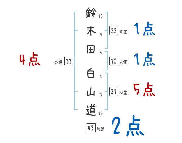 人運![]() | 鈴木田白山道さんの人運は10画の1つ星!不安を感じやすい傾向。ストレスを抱えないように注意しましょう。 性格や才能などを表す2番目に重要な運勢です。人間関係や協調性、社会的な成功に影響します。主に20歳から50歳ぐらいまでの中年期の運勢を表します。 |