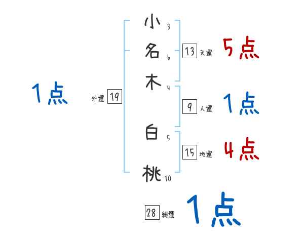 総運![]() | 小名木白桃さんの総運は28画の1つ星!家庭環境に注意。スポーツで活躍できる能力があるかも。 あなたの人生を表す1番重要な運勢です。生涯を通じて影響する総合運となり、主に50歳以降の晩年期に影響を及ぼします。 |