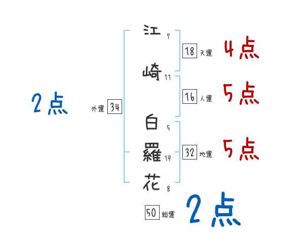 天運![]() | 江崎白羅花さんの天運は18画の4つ星!情熱的で剛気。忍耐力があり信頼される。 家系が持つ宿命的な運勢を表します。祖先から受け継いだ苗字ですので自分の力が及びません。家柄を象徴します。 |