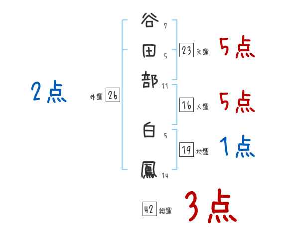 天運![]() | 谷田部白鳳さんの天運は23画の5つ星!想像力に優れ活力がある。一代で成功し名誉を手に入れる。 家系が持つ宿命的な運勢を表します。祖先から受け継いだ苗字ですので自分の力が及びません。家柄を象徴します。 |