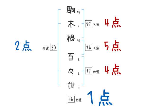 総運![]() | 駒木根百々世さんの総運は46画の1つ星!迷走することが多く苦労するかも。目先のことにとらわれないように。 あなたの人生を表す1番重要な運勢です。生涯を通じて影響する総合運となり、主に50歳以降の晩年期に影響を及ぼします。 |