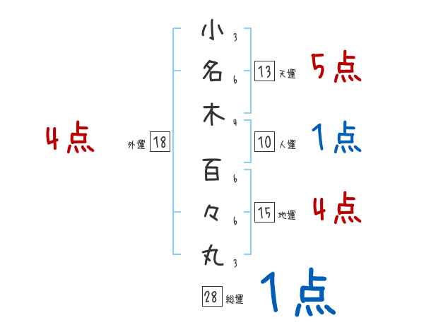 総運![]() | 小名木百々丸さんの総運は28画の1つ星!家庭環境に注意。スポーツで活躍できる能力があるかも。 あなたの人生を表す1番重要な運勢です。生涯を通じて影響する総合運となり、主に50歳以降の晩年期に影響を及ぼします。 |