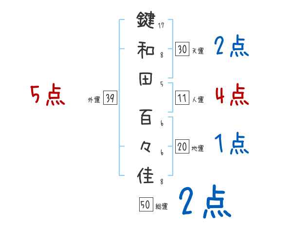 外運![]() | 鍵和田百々佳さんの外運は39画の5つ星!社交性に優れ人望が厚い。人の上に立ち成功する。 生活面を象徴する運勢です。外部から受ける影響力を表し、結婚運、家庭運や職場、環境への順応性を表します。 |
