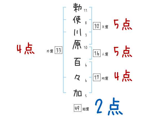 人運![]() | 勅使川原百々加さんの人運は16画の5つ星!人望が厚く大きく発展する。逆転成功が見える。 性格や才能などを表す2番目に重要な運勢です。人間関係や協調性、社会的な成功に影響します。主に20歳から50歳ぐらいまでの中年期の運勢を表します。 |