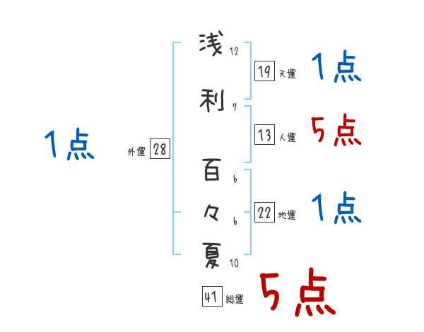 外運![]() | 浅利百々夏さんの外運は28画の1つ星!家庭環境に注意。スポーツで活躍できる能力があるかも。 生活面を象徴する運勢です。外部から受ける影響力を表し、結婚運、家庭運や職場、環境への順応性を表します。 |