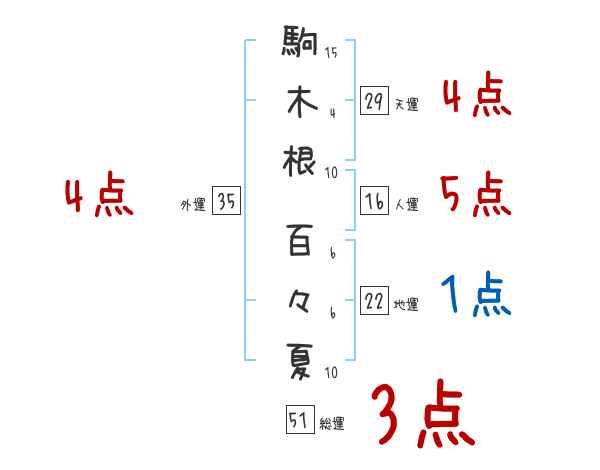 外運![]() | 駒木根百々夏さんの外運は35画の4つ星!温厚な性格で感受性が高い。穏和な性格で人望が厚い。 生活面を象徴する運勢です。外部から受ける影響力を表し、結婚運、家庭運や職場、環境への順応性を表します。 |