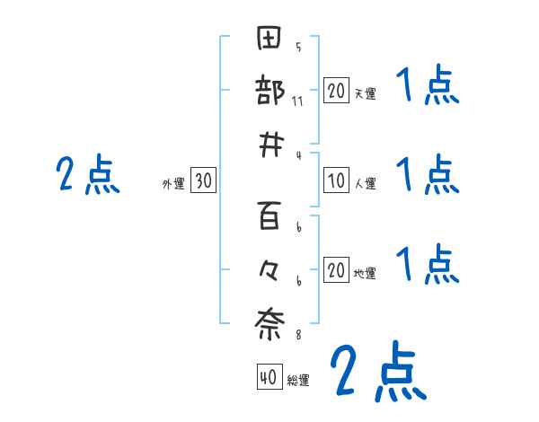 総運![]() | 田部井百々奈さんの総運は40画の2つ星!自信過剰で物事に固執するためトラブルに注意。 あなたの人生を表す1番重要な運勢です。生涯を通じて影響する総合運となり、主に50歳以降の晩年期に影響を及ぼします。 |
