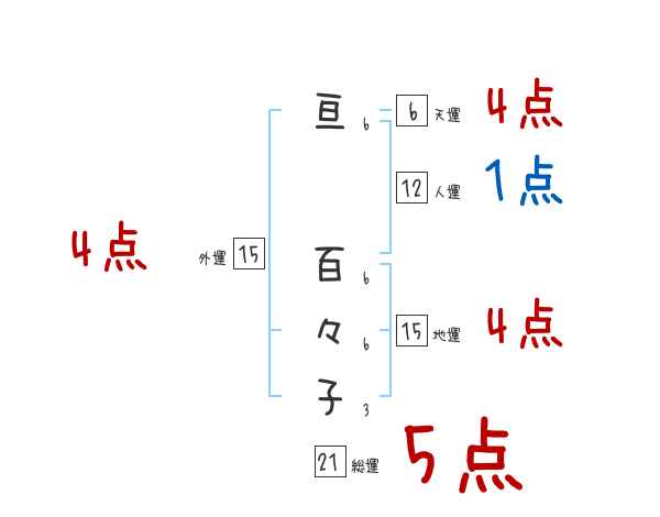 天運![]() | 亘百々子さんの天運は6画の4つ星!慎重な努力家で信頼を得る。誠実な精神で向上心に優れる。 家系が持つ宿命的な運勢を表します。祖先から受け継いだ苗字ですので自分の力が及びません。家柄を象徴します。 |