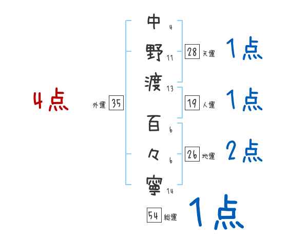 天運![]() | 中野渡百々寧さんの天運は28画の1つ星!家庭環境に注意。スポーツで活躍できる能力があるかも。 家系が持つ宿命的な運勢を表します。祖先から受け継いだ苗字ですので自分の力が及びません。家柄を象徴します。 |