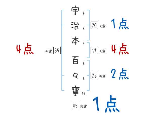 外運![]() | 宇治本百々寧さんの外運は35画の4つ星!温厚な性格で感受性が高い。穏和な性格で人望が厚い。 生活面を象徴する運勢です。外部から受ける影響力を表し、結婚運、家庭運や職場、環境への順応性を表します。 |