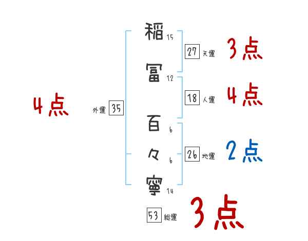 外運![]() | 稲冨百々寧さんの外運は35画の4つ星!温厚な性格で感受性が高い。穏和な性格で人望が厚い。 生活面を象徴する運勢です。外部から受ける影響力を表し、結婚運、家庭運や職場、環境への順応性を表します。 |