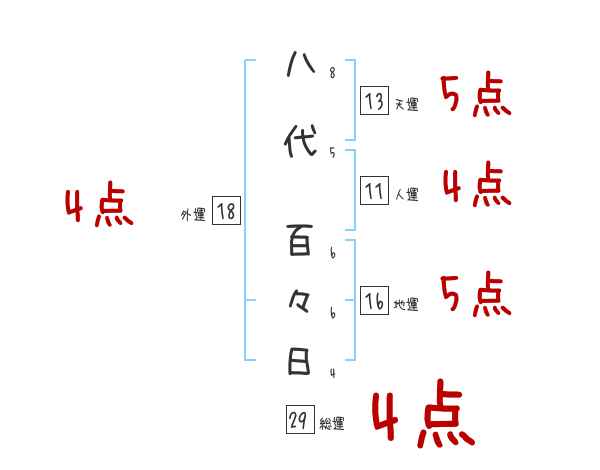 総運![]() | 八代百々日さんの総運は29画の4つ星!完全主義で才能がある。厳格な心の持ち主。 あなたの人生を表す1番重要な運勢です。生涯を通じて影響する総合運となり、主に50歳以降の晩年期に影響を及ぼします。 |