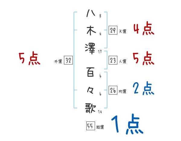 外運![]() | 八木澤百々歌さんの外運は32画の5つ星!柔軟性があり成功する。チャンスが多く金運が良い。 生活面を象徴する運勢です。外部から受ける影響力を表し、結婚運、家庭運や職場、環境への順応性を表します。 |