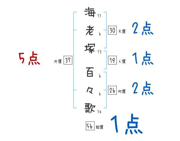 天運![]() | 海老塚百々歌さんの天運は30画の2つ星!浮き沈みの激しさに注意しましょう。 家系が持つ宿命的な運勢を表します。祖先から受け継いだ苗字ですので自分の力が及びません。家柄を象徴します。 |