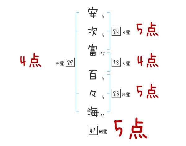 天運![]() | 安次富百々海さんの天運は24画の5つ星!家庭運が良く順調な人生。金運にも恵まれる。 家系が持つ宿命的な運勢を表します。祖先から受け継いだ苗字ですので自分の力が及びません。家柄を象徴します。 |