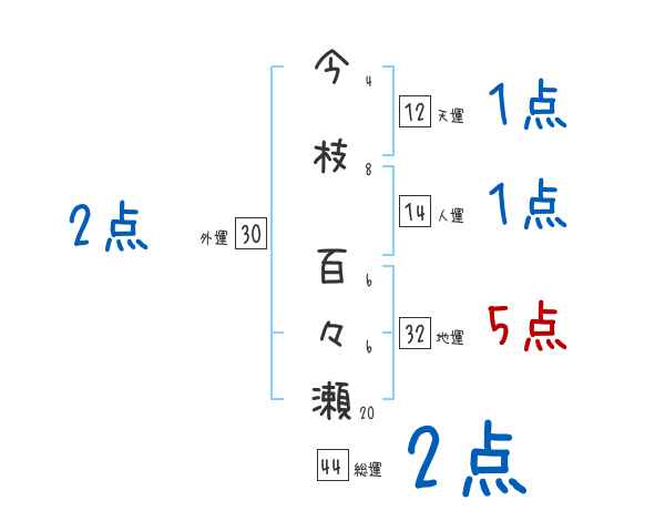 総運![]() | 今枝百々瀬さんの総運は44画の2つ星!誠実で慎重な性格。物事を考えすぎないように注意しましょう。 あなたの人生を表す1番重要な運勢です。生涯を通じて影響する総合運となり、主に50歳以降の晩年期に影響を及ぼします。 |