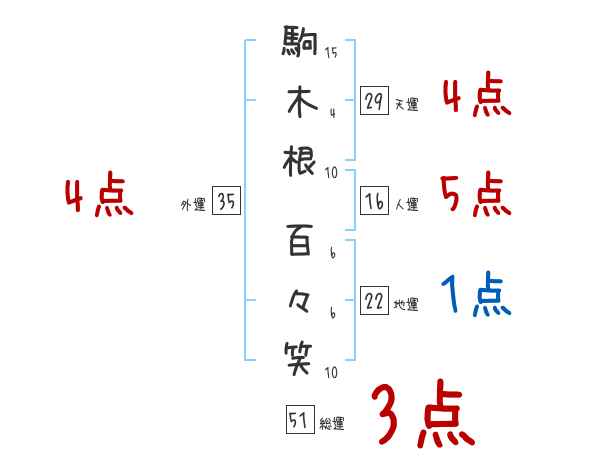 人運![]() | 駒木根百々笑さんの人運は16画の5つ星!人望が厚く大きく発展する。逆転成功が見える。 性格や才能などを表す2番目に重要な運勢です。人間関係や協調性、社会的な成功に影響します。主に20歳から50歳ぐらいまでの中年期の運勢を表します。 |