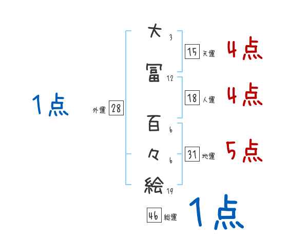 外運![]() | 大冨百々絵さんの外運は28画の1つ星!家庭環境に注意。スポーツで活躍できる能力があるかも。 生活面を象徴する運勢です。外部から受ける影響力を表し、結婚運、家庭運や職場、環境への順応性を表します。 |
