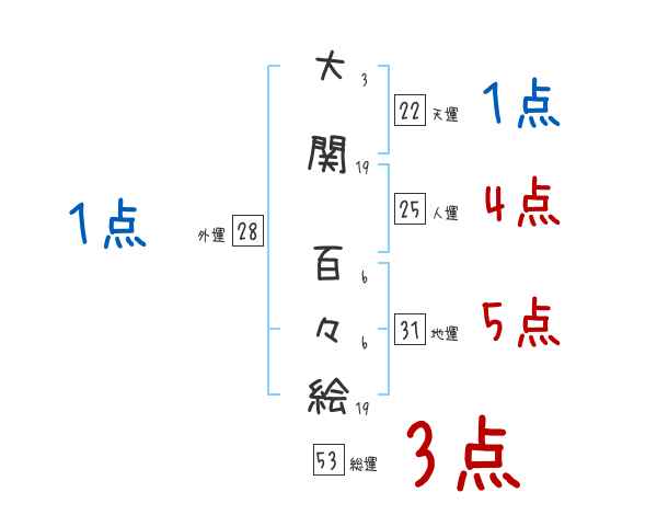 総運![]() | 大関百々絵さんの総運は53画の3つ星!やや見栄っ張りで虚栄心がある。散財に注意。 あなたの人生を表す1番重要な運勢です。生涯を通じて影響する総合運となり、主に50歳以降の晩年期に影響を及ぼします。 |