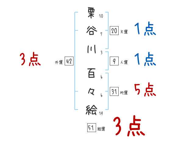 総運![]() | 栗谷川百々絵さんの総運は51画の3つ星!変化が激しく、危険に注意。堅実な性格。 あなたの人生を表す1番重要な運勢です。生涯を通じて影響する総合運となり、主に50歳以降の晩年期に影響を及ぼします。 |