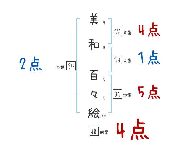 外運![]() | 美和百々絵さんの外運は34画の2つ星!独創性に優れるが、自尊心が強く災難に注意しましょう。 生活面を象徴する運勢です。外部から受ける影響力を表し、結婚運、家庭運や職場、環境への順応性を表します。 |
