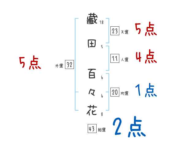 外運![]() | 藏田百々花さんの外運は32画の5つ星!柔軟性があり成功する。チャンスが多く金運が良い。 生活面を象徴する運勢です。外部から受ける影響力を表し、結婚運、家庭運や職場、環境への順応性を表します。 |