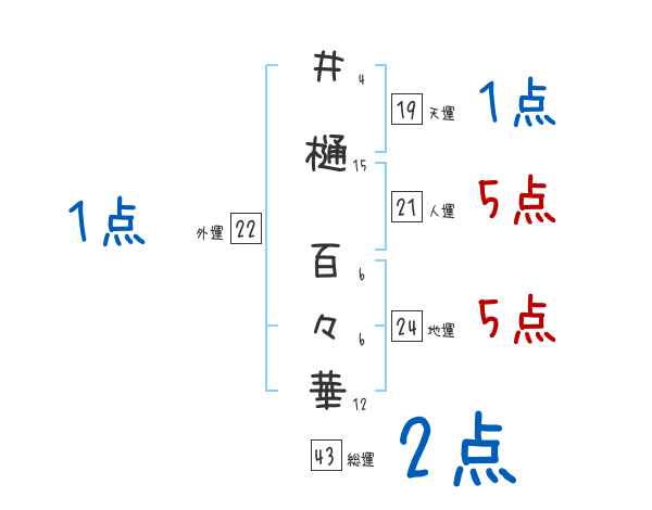総運![]() | 井樋百々華さんの総運は43画の2つ星!頑固な性格で独立心が強いかも。やや非現実的で浪費に注意しましょう。 あなたの人生を表す1番重要な運勢です。生涯を通じて影響する総合運となり、主に50歳以降の晩年期に影響を及ぼします。 |