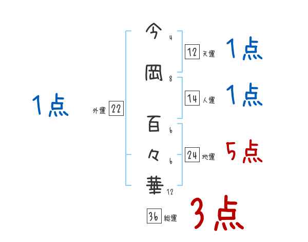 外運![]() | 今岡百々華さんの外運は22画の1つ星!努力することが苦手ないっぽう手先が器用。芸術性にも優れる。 生活面を象徴する運勢です。外部から受ける影響力を表し、結婚運、家庭運や職場、環境への順応性を表します。 |