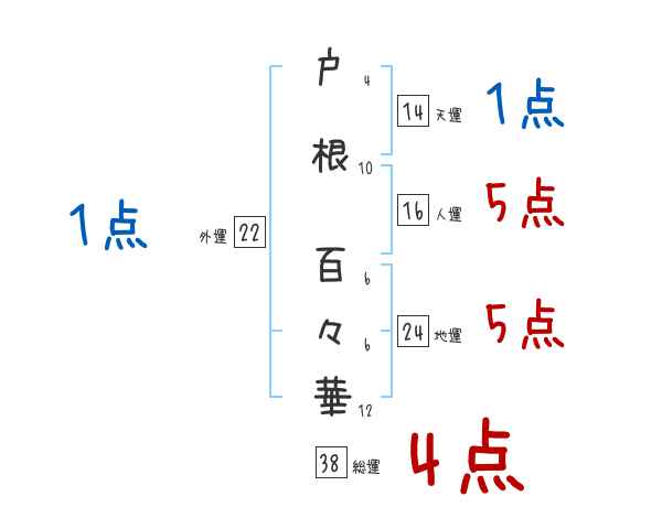 人運![]() | 戸根百々華さんの人運は16画の5つ星!人望が厚く大きく発展する。逆転成功が見える。 性格や才能などを表す2番目に重要な運勢です。人間関係や協調性、社会的な成功に影響します。主に20歳から50歳ぐらいまでの中年期の運勢を表します。 |