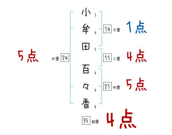 総運![]() | 小牟田百々香さんの総運は35画の4つ星!温厚な性格で感受性が高い。穏和な性格で人望が厚い。 あなたの人生を表す1番重要な運勢です。生涯を通じて影響する総合運となり、主に50歳以降の晩年期に影響を及ぼします。 |